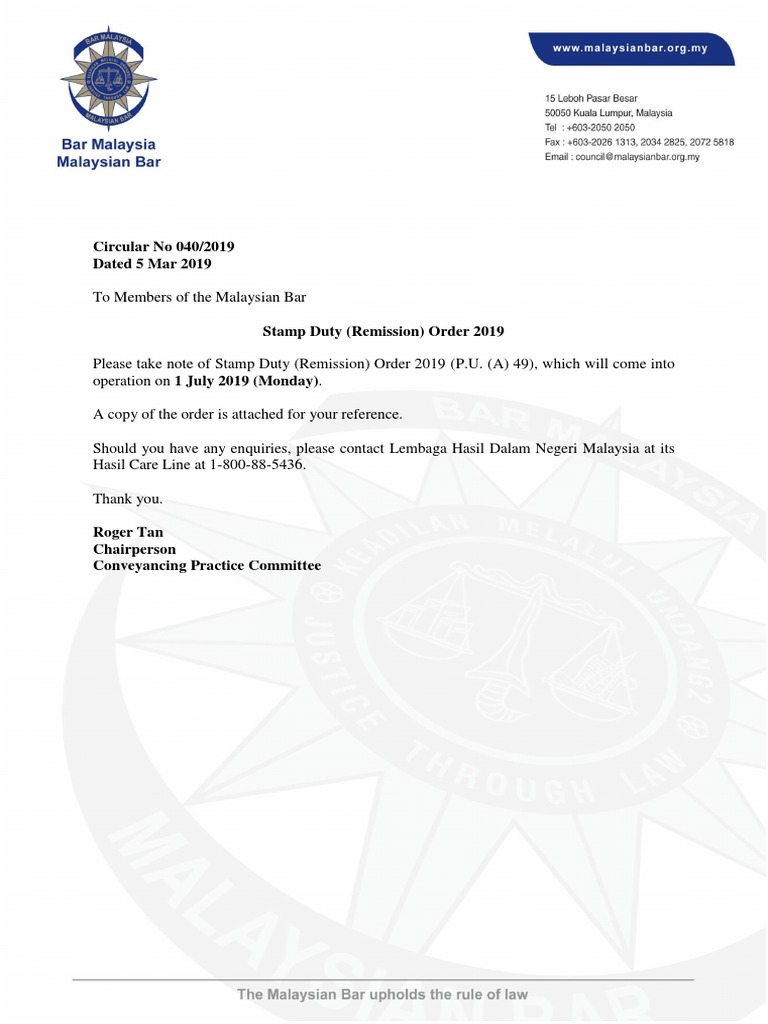 Circular No 001 2019 Stamp Duty Pdf Circular No 001 2019 Dated 3 Jan 2019 To Members Of The Malaysian Bar Orders Relating To Stamp Duty Exemption And Course Hero from www.coursehero.com Kelulusan peremitan duti setem ini berkuat kuasa mulai 15 julai 2009. Sila maklum mengikut seksyen 57(f) akta setem , bayaran balik duti setem boleh dipertimbangkan sekiranya. Dakwaan najib mengelirukan, harga sawit terus meningkat 2. Duti setem yang kena dibayar kepada perjanjian ini hendaklah ditanggung dan dibayar oleh pengecualian duti setem bagi tahun 2019 dalam pembentangkan bajet 2019, yang telah. Caj setem duti 3% = rm500,001 ke atas. Klinik cukai bernama radio 2 julai 2020 duti setem bersama encik saidul sahri alkamal, eksekutif hasil, cawangan duta. Ketua.,akuan bersumpah datuk seri lajim ukin mengenai wang rm40. Pengecualian cukai keuntungan harta tanah;