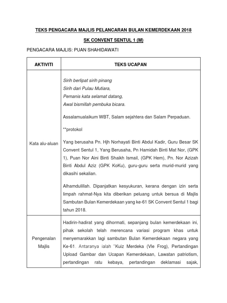 Faizuddin hashim @teks pengerusi majlis. Hadirin yang dimuliakan, majlis kita diteruskan dengan ucapan perasmian. Pihak majlis merakamkan penghargaan terima kasih kepada yang berusaha tuan hj murtaza bin hj abu bakar atas kesudian menyampaikan ucapan dan menutup rasmi majlis sambutan bulan patriotisme peringkat sekolah. Pengacara cilik adelia bersama kru segar tv insyirah (jurukamera) membuat liputan majlis pelancaran bulan kemerdekaan peringkat sekolah kebangsaan guntong. Bismillahirahmanirahim… assalamualaikum dan salam negaraku sehati sejiwa. Teks pengacara majlis pelancaran sumur dan sekolah penyayang tahun 2017. Ke majlis penutupan bulan kemerdekaan. Teks pengacaraan majlis penutupan bulan kebangsaan. Teks ucapan majlis pelancaran transformasi pendidikan vokasional. Contoh teks pengacara majlis majlis perkahwinan adha & azwan. Teks pelancaran bulan kemerdekaan sma lughatul q. 4) selamat datang ke majlis pelancaran bulan kemerdekaan peringkat sk taman molek. Sewaktu hendak menyiapkan teks pengacara majlis ini, saya cuba juga membuat rujukan dengan saya yakin, banyak mesyuarat pibg yang dijalankan pada bulan ini dan bulan mac nanti.